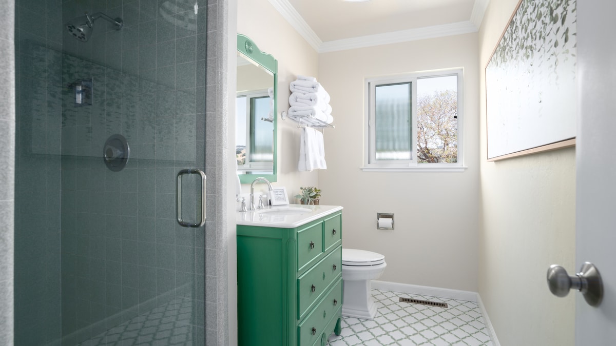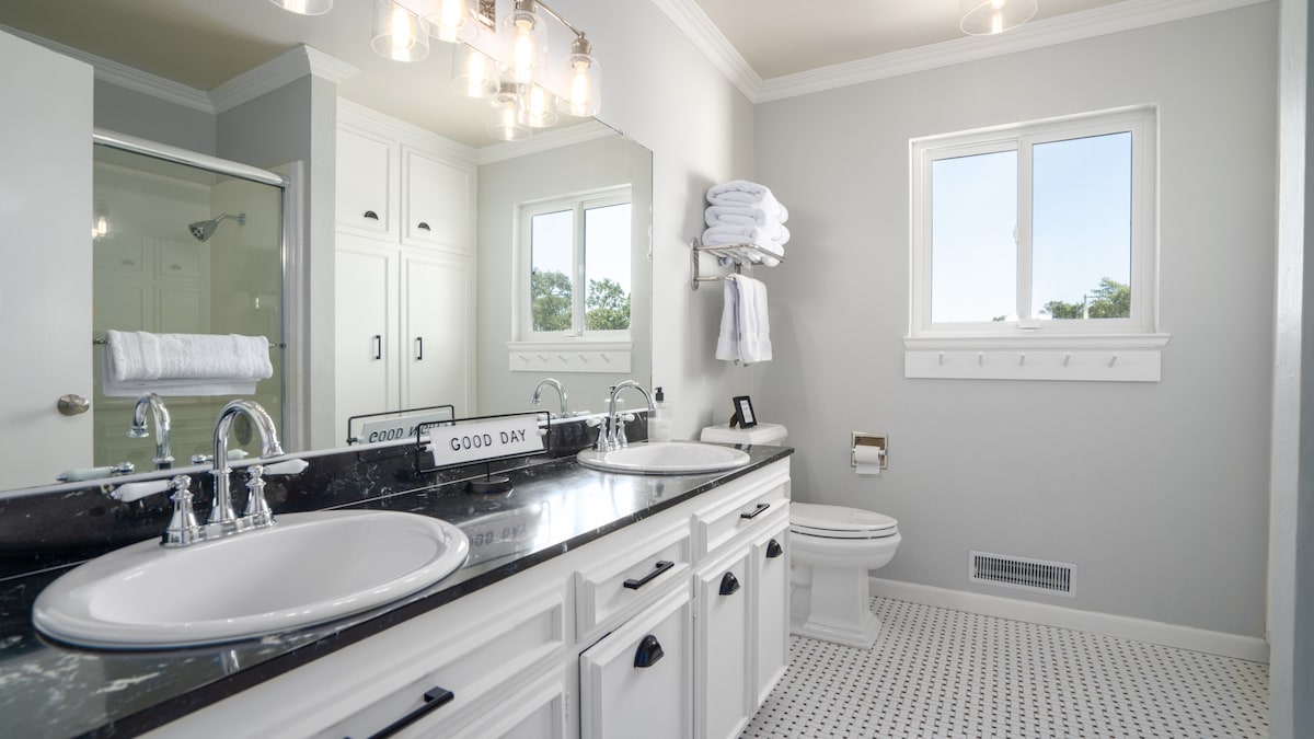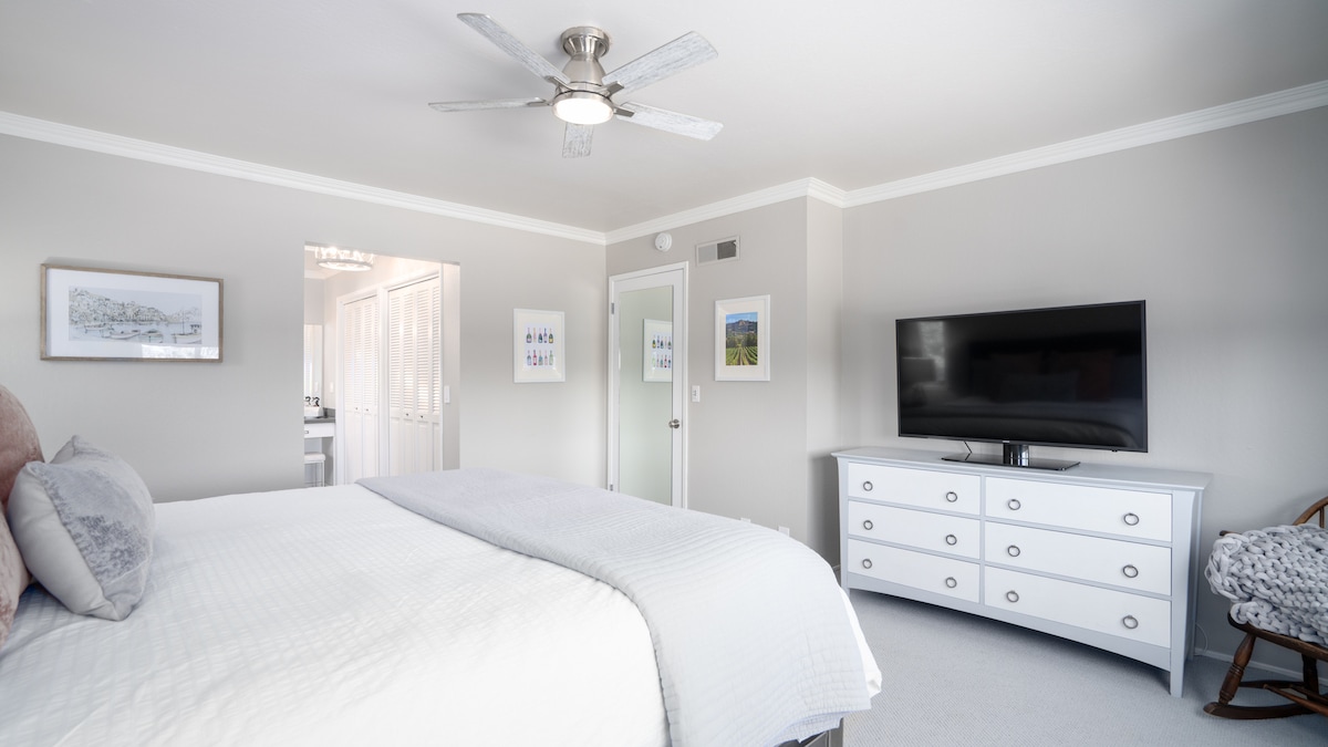 Modern and comfortable bedrooms, include a large primary suite with dressing room and ensuite bathroom with Speakman dual head shower and Toto Neorest. The three additional upstairs guest bedrooms feature architectural ceiling fans, full length mirrors, custom window treatments, large closets and Lutron Caseta smart lighting system. In addition to the four upstairs bedrooms, there is an additional bedroom downstairs off the family room that can comfortably accommodate 2 guests.