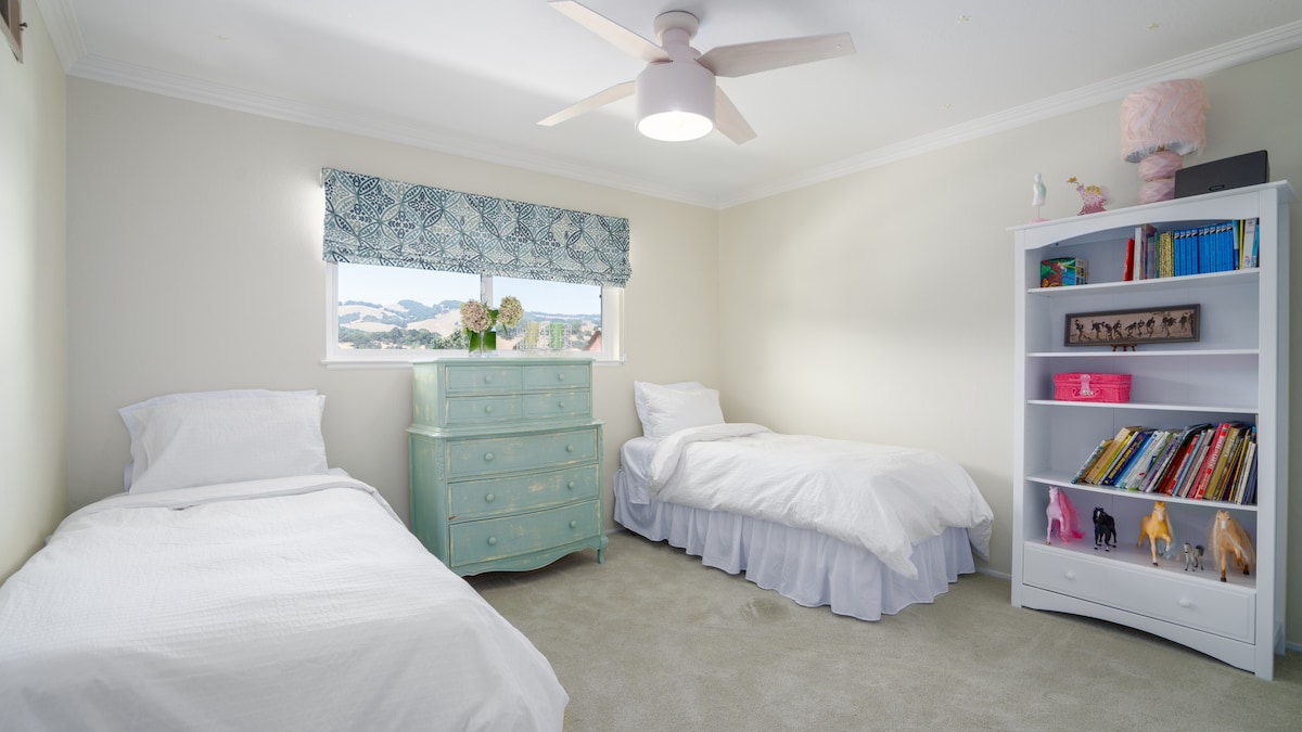 Bedroom 4: Two twin beds, shared access to hall bathroom with dual vanities and shower over tub