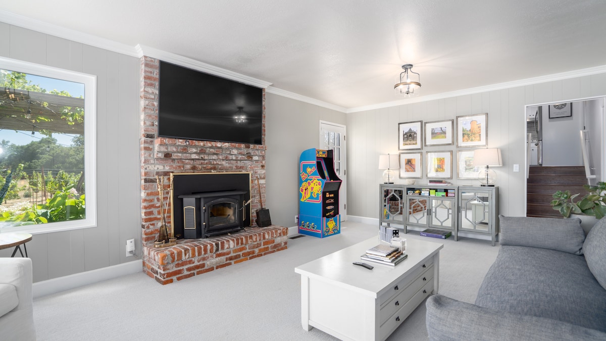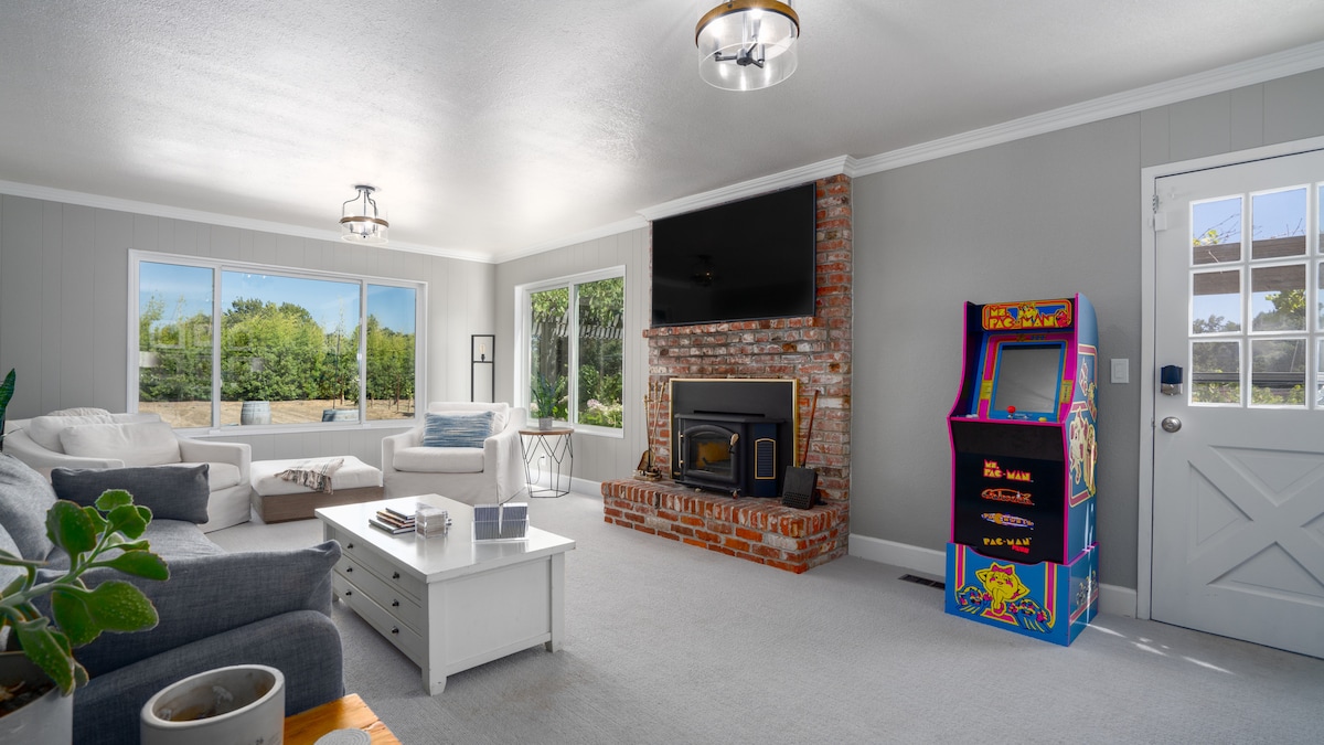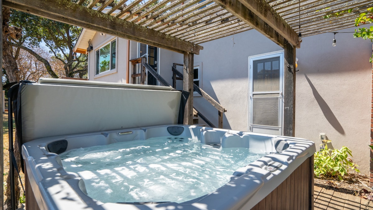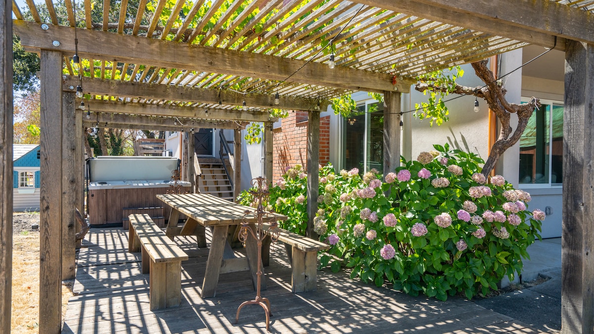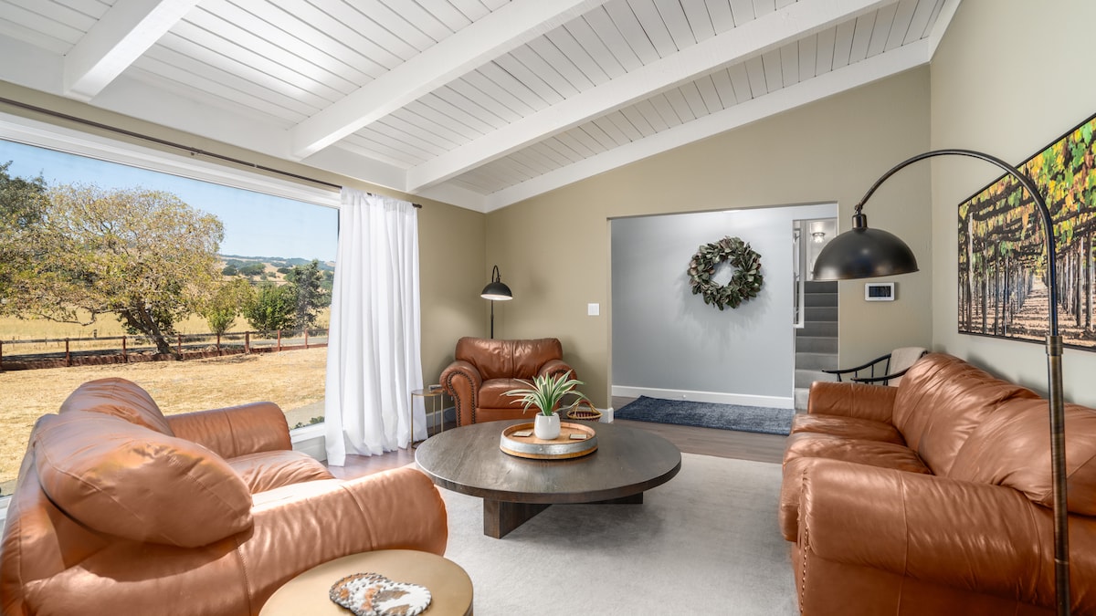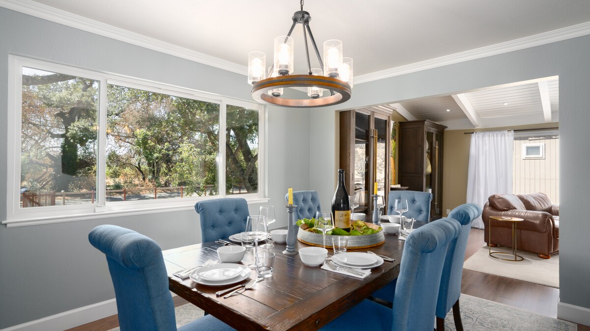 The formal living room is the ideal space to entertain. The formal dining room seats 10 and overlooks the Grace Benoist Ranch vineyard. The large family room is designed for fun and relaxation. Included are a large screen TV - great for movie viewing with a crowd, full sized wood burning fireplace, ample board games, puzzles and a full size PacMan machine. The hot tub purchased in 2023 is perfect for enjoying a glass of wine while gazing at the sunset or soaking under the stars. The updated kitchen includes a full sized dining area with an adjoining private deck  just right for enjoying morning coffee alfresco.